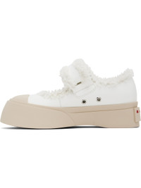 Buffed leather Mary Jane-style ballerina flats in white. · Shearling trim throughout · Rubber cap toe · Velcro strap at vamp · Eyelet vents at inner side · Logo embossed at leather footbed · Shearling lining · Logo embossed at heel · Treaded rubber platform sole · Platform: H1.75" Supplier color: Ivory/Lily white Upper: leather. Sole: rubber. Made in Italy 242379F128012