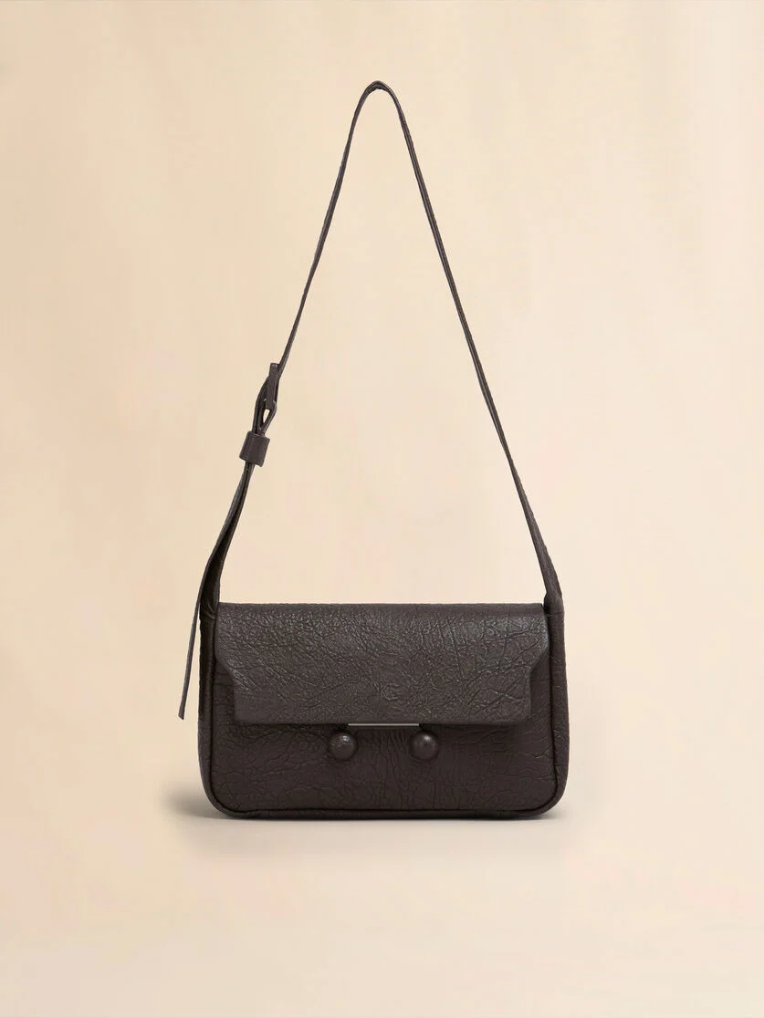 Trunkaroo Soft shoulder bag made of nappa leather with a natural grain. Medium size. The rectangular shape features a front flap closed via a large magnetic clasp engraved with the Marni logo and two half spheres covered in tonal leather. Nappa lining with single pocket. Adjustable leather strap with tonal buckle. Made in Italy MODEL SBMP0213U0P803300M80 COMPOSITION Body: 100% Ovine Leather - Contrast: 100% Ovine Leather - Lining: 100% Ovine Leather - Metallic Parts: 100% Brass - Metallic Parts: 100% Polyamide-Nylon - Metallic Parts: 100% Zama