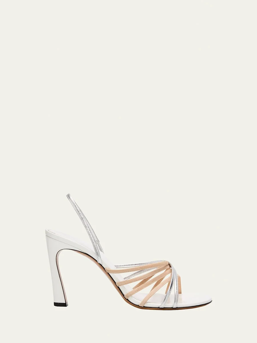 Marni strappy slingback sandals in suede, metallic leather, and solid leather 3.00 in / 75 mm stiletto heel Open toe Crossover strappy vamp Stretch slingback strap Leather outsole Lining: Goat leather Spot clean Made in Italy Online Inquiries: BGS21_X6V71| Store Inquiries: #4989473