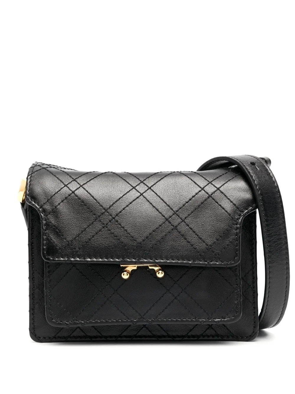 mini Trunk shoulder bag black cotton/calf leather twill weave gold-tone hardware foldover top with press-stud fastening internal zip-fastening pocket internal patch pocket internal logo plaque adjustable detachable shoulder strap partitioned compartment Made in Italy Composition Outer: Calf Leather 100% Lining: Cotton 100% SIZE & FIT Model measurements Height 5 ft 9 in(1.76 m) Bust/Chest 33.07 in(84 cm) Hips 38.58 in(98 cm) Waist 24.8 in(63 cm) Measurement DEPTH 3.14 in(8 cm) HEIGHT 5.11 in(13 cm) STRAP 23.62 in(60 cm) WIDTH 6.69 in(17 cm)