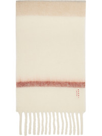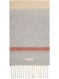 Rectangular brushed mohair- and alpaca-blend flannel scarf. · Stripes throughout · Embroidered logo patch at face · Fringed detailing at ends · L89" x W14.5" Supplier color: Moccasin 28% mohair, 28% alpaca, 24% virgin wool, 20% polyamide. Made in Italy 252379F028004