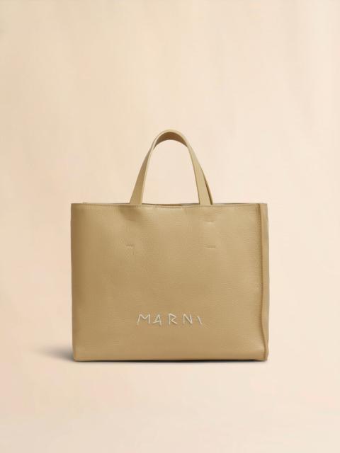 Museo Soft East/West shopping bag, small size,in tumbled leather with magnet closure; zipped pocket inside. Fabric lining. Leather top handles and detachable shoulder strap, adjustable with buckle. Tonal hand-stitched Marni Mending logo. This product is made using leather from a Leather Working Group medalled tannery. LWG supports more responsible leather manufacturing across the globe. Made in Italy MODEL SHMP0069L3P653300N99 COMPOSITION T1 100% PBV - T2 100% PL - T3 95% CO 5% PC - T4 100% PBV - T5 100% OTN - T6 100% ACC - T7 100% ZAMA