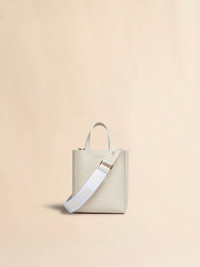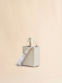 North/South Museo tote bag crafted from smooth calfskin leather. Mini size. Inside open pocket and fabric drawstring liner. Leather top handles. Detachable and adjustable recycled tape shoulder strap with Marni lettering. Gold hardware. Gold logo print on the front. Made in Italy MODEL SHMP0039U1LV63900W23 COMPOSITION Body: 100% Calf Leather - Inside: 100% Calf Leather - Contrast: 100% Polyester - Lining: 55% Cotton 45% Polyurethane - Lining: 100% Cotton - Metallic Parts: 100% Zama - Metallic Parts: 100% Brass