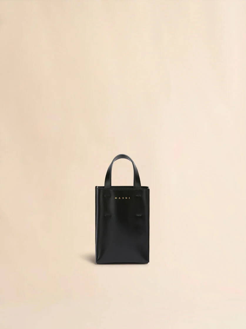 North/South tote bag, nano size, in calf leather with internal slot pocket. Leather top handles and detachable shoulder strap, adjustable with buckle. Gold hardware. Gold printed logo outside. Made in Italy MODEL SHMP0050U0LV63900N99 COMPOSITION Body: 100% Calf Leather - Inside: 100% Calf Leather - Contrast: 100% Polyester - Lining: 55% Cotton 45% Polyurethane - Metallic Parts: 100% Zama - Metallic Parts: 100% Brass