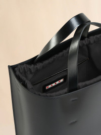 North/South tote bag, mini size, in calf leather with internal slot pocket. Fabric drawstring bag inside. Leather top handles and detachable shoulder strap, adjustable with buckle. Gold hardware. Gold printed logo outside. Made in Italy MODEL SHMP0039U1LV63900N99 COMPOSITION Body: 100% Calf Leather - Inside: 100% Calf Leather - Contrast: 100% Polyester - Lining: 55% Cotton 45% Polyurethane - Lining: 100% Cotton - Metallic Parts: 100% Zama - Metallic Parts: 100% Brass