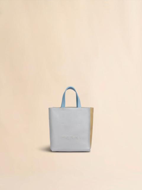 Museo North/South tote bag crafted from milled calfskin leather. Mini size. Colour-block design. Top handles and detachable and adjustable buckled shoulder strap. Open design with fabric lining and inside zip pocket. Hand-stitched Marni Mending logo on the front. Made in Italy MODEL SHMP0040L3P653300N99 COMPOSITION Body: 100% Calf Leather - Contrast: 100% Calf Leather - Contrast: 100% Polyester - Lining: 95% Cotton 5% Acrylic - Inside: 100% Calf Leather - Metallic Parts: 100% Brass - Metallic Parts: 100% Zama