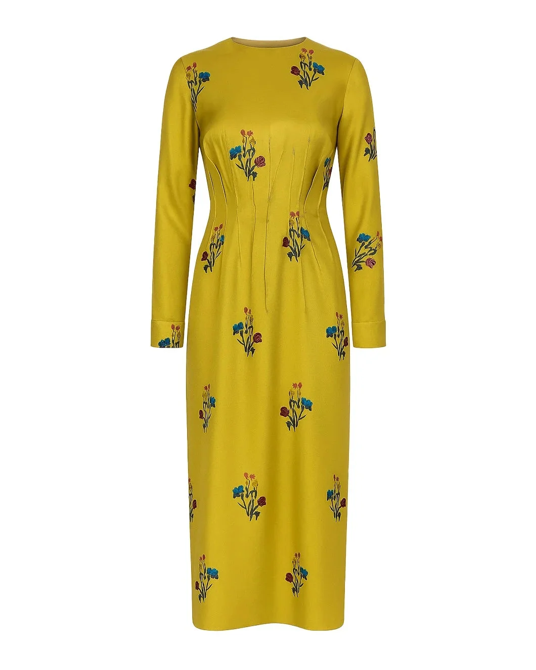 The Tulip Silk Twill Printed Dress in Citronelle by Marni is a long dress with a round neck and waist darts for a figure flattering silhouette. - 100% Silk Woven