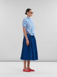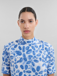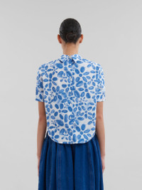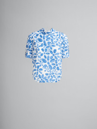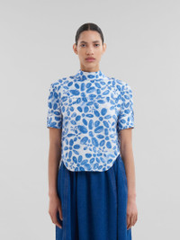 Short-sleeved top made from organic cotton poplin, featuring this season's Blooming floral print. Styled like a backwards shirt with collar, rear button closure and buttoned cuffs. Exaggerated rounded front and back hem. Hand-stitched Marni mending logo on the cuff. Made in Italy MODEL TTMA0351S1UTC410BLB50 FIT The model is 5' 11''. The model is wearing size 40 IT. COMPOSITION Primary Fabric: 100% Cotton Woven