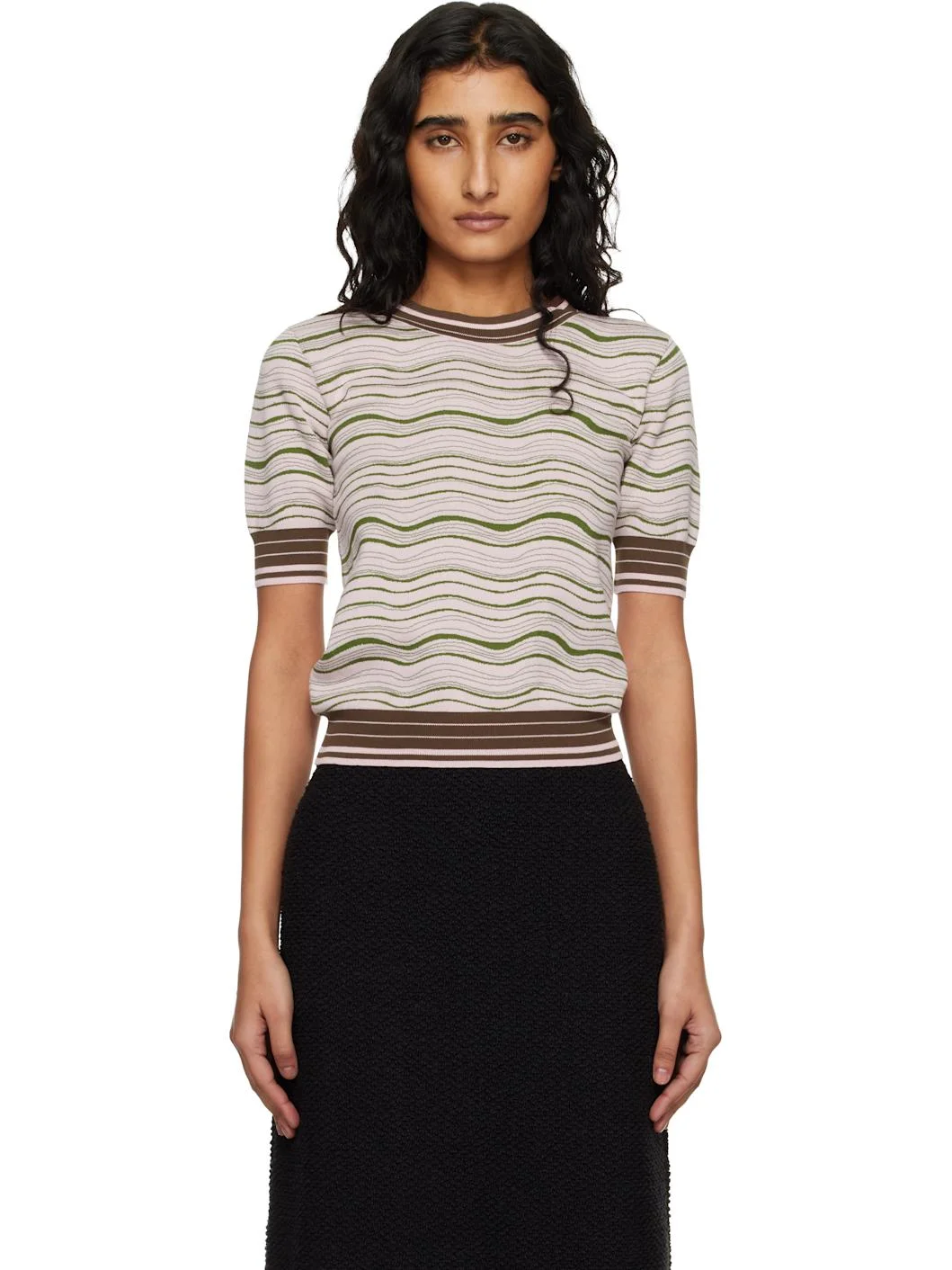 18-gauge knit cotton sweater. · Stripes throughout · Rib-knit crewneck, hem, and cuffs · Cropped hem · Logo embroidered at back collar Supplier color: Pink gummy Body: 100% polyamide. Trim: 90% polyamide, 10% elastane. Made in Italy 261379F096000