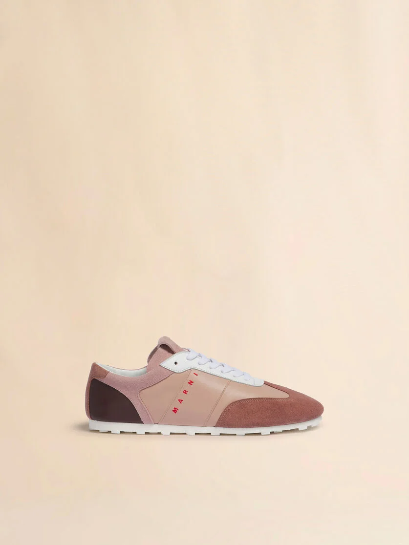 Low-top sneaker made from contrasting panels of nappa leather and suede. Inspired by retro football styles and designed to offer slipper-like comfort. Flexible rubber outsole and deconstructed, unlined upper. Red Marni logo on the side and logo grommets. Made in Italy MODEL SNZW020400P9097ZP039