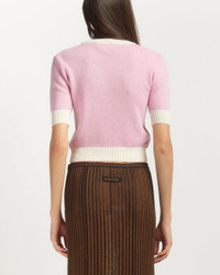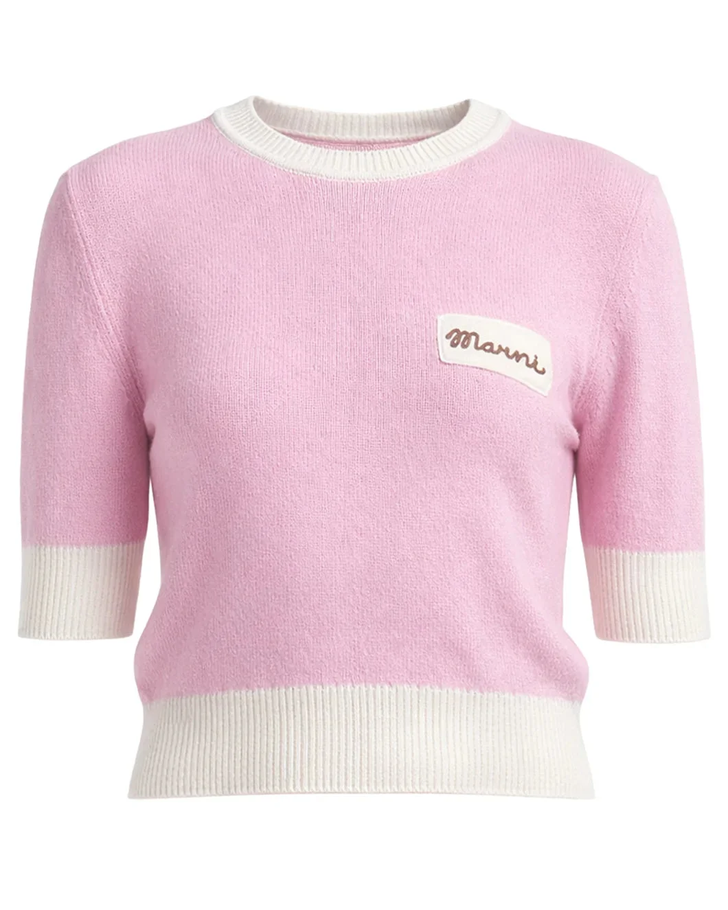 The Contrast Roundneck Sweater in Pink Gummy by Marni is a short sleeve, round neck sweater featuring a contrasting rib trim and Marni patch. - 80% Wool 20% Polyamide