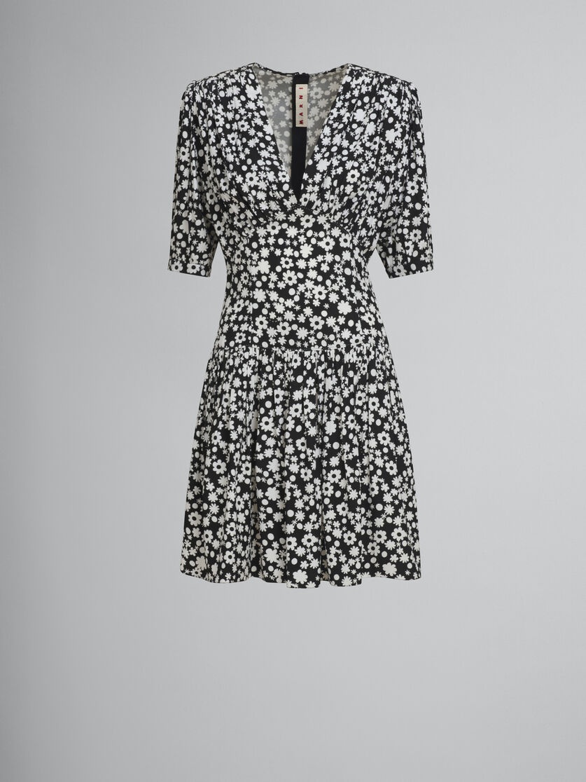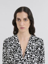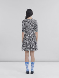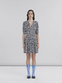 Enver satin dress with short sleeves and this season's Pop Fields motif all over. The bodice is fitted, with a deep V-neckline, and a flared skirt. Rear tonal zip. The main fabric in this garment is 100% viscose sourced from responsibly-managed forests. Made in Italy MODEL ABMA1398A0UTVA45PFN99 FIT The model is 5' 10''. The model is wearing size 40 IT. COMPOSITION Primary Fabric: 100% Viscose-Rayon Woven