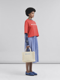 Short sleeved jersey cotton T-shirt with a boxy, cropped cut. A contrasting Marni Scribbled logo is printed on the front. MODEL THJE0333P5USCX42SLR63 FIT The model is 5' 9''. The model is wearing size 40 IT. COMPOSITION Primary Fabric: 100% Cotton Knit