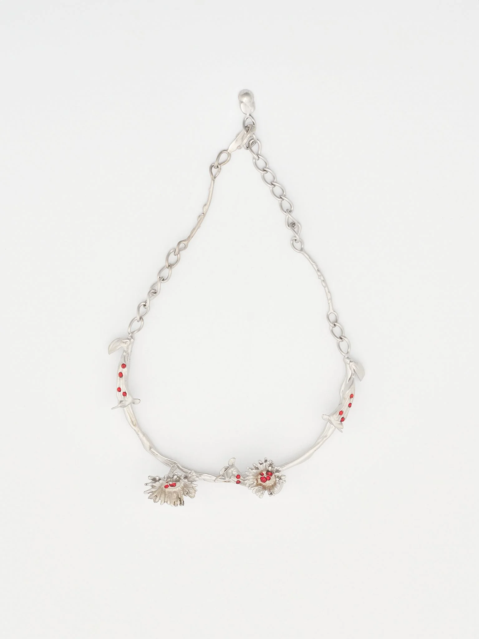 MARNI necklace in silver & red, choker design, metal construction, reflective finish, decorative flower embellishment, rhinestone-encrusted detailing, adjustable chainlink, hook clasp closure, engraved hallmarking. Made in Italy 100% CRS One Size