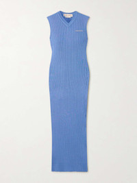 EDITORS'NOTES Marni's dress is made from flexible ribbed-knit with a smooth texture and subtle sheen. Perfect for casual occasions, it has a high V-neckline and logo embroidery at the chest. The dramatic back split ensures it's comfortable to walk in. Wear it with heels or sneakers. SIZE & FIT Model measurements: - Fits true to size, take your normal size - Designed for a close fit - Mid-weight knit - Model is 177cm/ 5'10" and is wearing an IT 38 - Bust: 79cm/ 31" - Waist: 61cm/ 24" - Hip: 89cm/ 35" DETAILS & CARE - Light-blue and yellow viscose.blend - Slips on - 92% viscose, 7% polyamide, 1% elastane - Dry clean