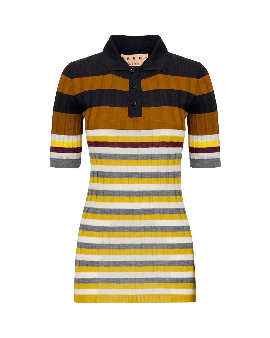 The Short Sleeve Polo Neck with Mixed Stripes in Lemon by Marni is a short sleeve, rib knit top featuring a collared neckline and button placket crafted in a light ribbed wool with contrasting colored stripes.