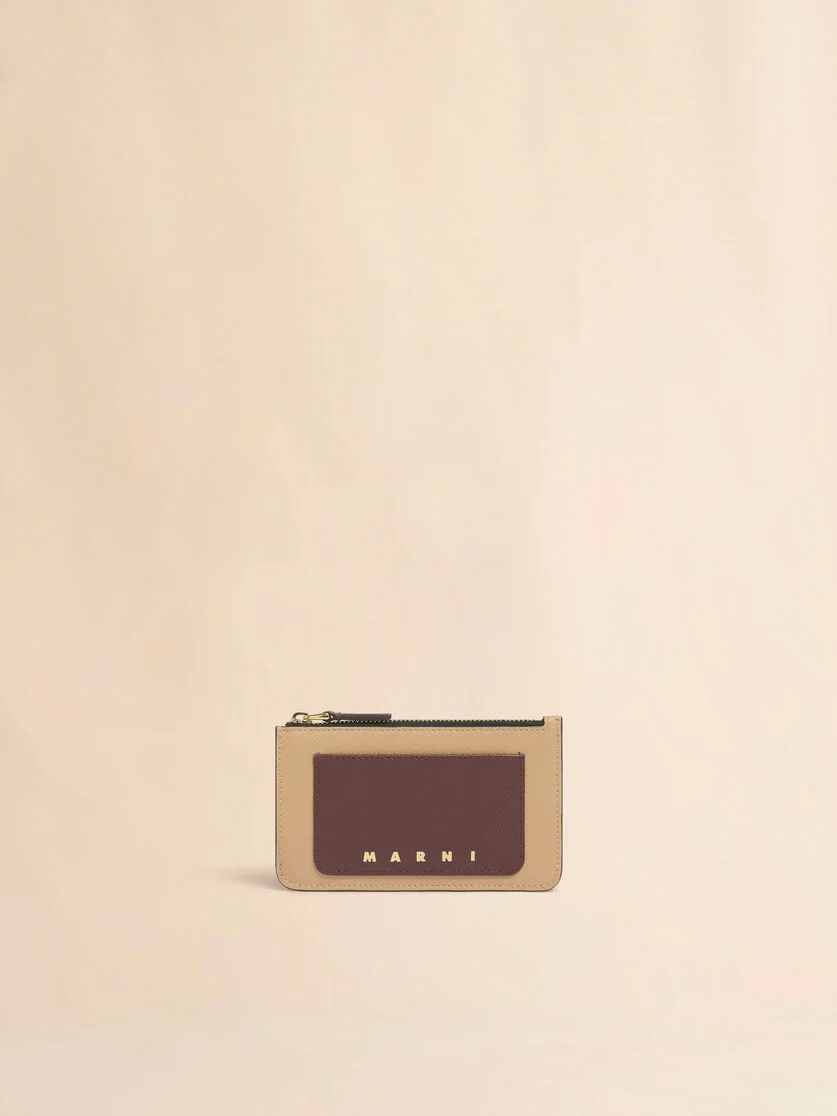 Cardholder made from saffiano leather in three contrasting tones. One zipper coin pocket and four rear card slots. Gold Marni logo print. Made in Italy MODEL PFMO0025U7LV520ZP059