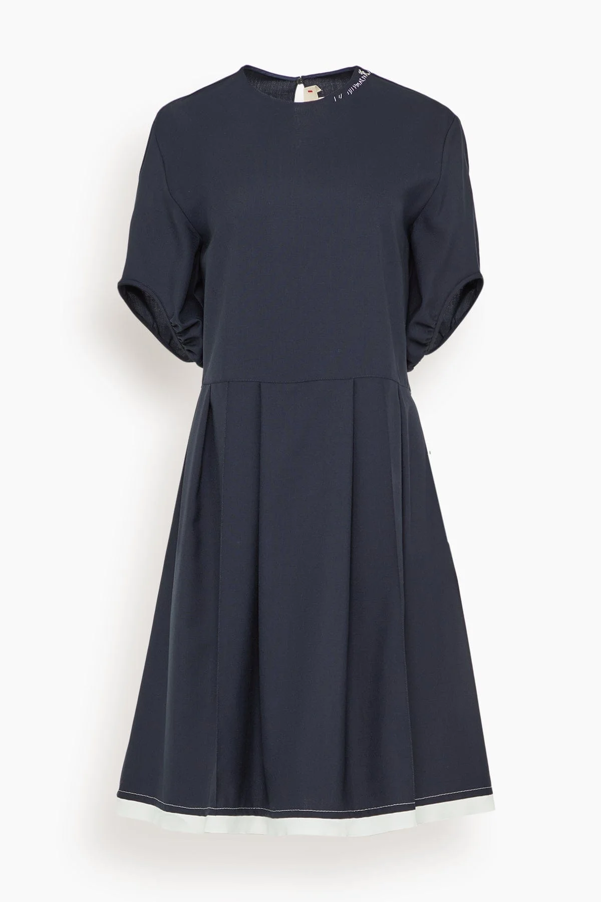 The Marni Short Sleeve Dress in Blue/Black will be in your wardrobe for years to come. This knee length dress features a loose silhouette with a drop waistline and contrasting hemline. Wear yours with loafers and a shoulder bag. - Knee length - Loose silhouette - Drop waistline - Pleated skirt - 100% virgin wool woven