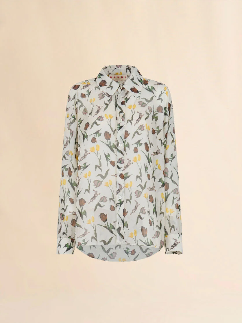 Chiffon creponne shirt, printed with a delicate motif of tulips and jumping hares. Relaxed fit with gathered back yoke. Made in Italy MODEL CAMA0593V0UTSG34THW04 COMPOSITION Primary Fabric: 100% Silk Woven - Lining: 60% Cupro 40% Silk
