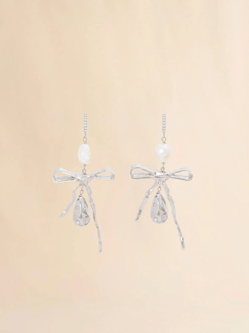 Shiny palladium metal earrings with bow pendant, sculpted to imitate the graceful movement of cascading fabric. Adorned with natural freshwater pearls. Rhinestone-studded hoop closure. Made in Italy MODEL ORMV0593A0M200100N29 COMPOSITION Body: 90% Brass 5% Aluminium 5% Pearl