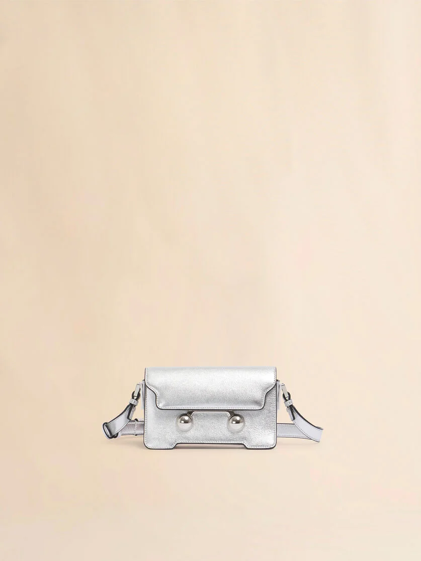 Trunkaroo rectangular mini shoulder bag crafted from metallic leather. Front flap with magnetic closure, featuring engraved Marni lettering and oversized stud details. Contoured base on the front and back. One compartment with inside pocket. Lined in nappa leather. Detachable and adjustable buckled shoulder strap: can also be worn as a clutch. Made in Italy MODEL SBMP0193U3P498900N20 COMPOSITION Body: 100% Ovine Leather - Lining: 100% Ovine Leather - Metallic Parts: 100% Brass - Metallic Parts: 100% Steel