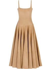 sleeveless A-line midi dress beige rear button fastening fitted bodice flared skirt square neckline adjustable shoulder straps pleated design Made in Italy Composition Sheep Suede 100% Washing instructions Read Manufacturer Guidelines