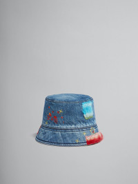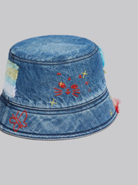 Bucket hat made from stonewashed organic denim. Embellished with coloured mohair patches and embroidery. Made in Italy DETAILS COMPOSITION Primary Fabric: 100% Cotton Woven - Lining: 100% Cotton Woven - Application: 80% Mohair Knit 20% Polyamide Knit