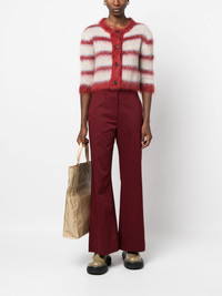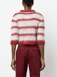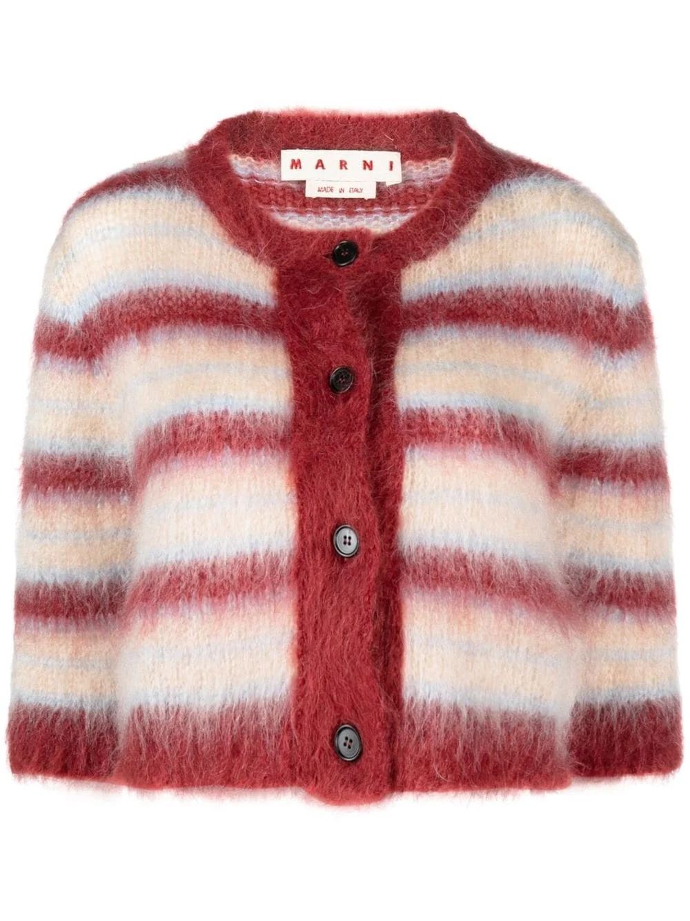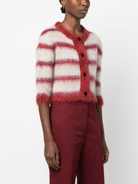 striped button-up cardigan Highlights - Red/white - Mohair blend - Brushed finish - Horizontal stripe pattern - Round neck - Front button fastening - Half-length sleeves - Straight hem Made in Italy Composition Mohair 67%, Polyamide 28%, Wool 5% SIZE & FIT Model measurements Height 5 ft 10 in(1.78 m) Bust/Chest 31.49 in(80 cm) Hips 37 in(94 cm) Waist 23.62 in(60 cm) FittingInformation Designed for a relaxed fit, this piece allows for comfort and movement when worn Made with a midweight knit, this piece offers some stretch This piece fits true to size – take your usual size