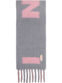 Rectangular brushed wool- and mohair-blend flannel scarf. · Stripes and embroidered logo patch at face · Jacquard logo at back face · Fringed detailing at ends · L90" x W11" Supplier color: Truffle 50% wool, 20% polyamide, 15% mohair, 15% alpaca. Made in Italy 252379F028008