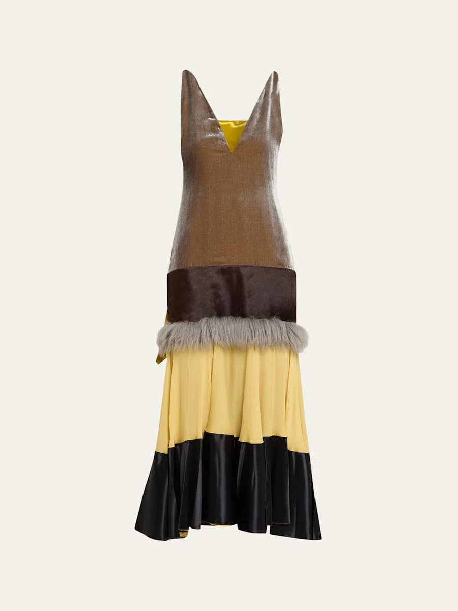 Marni dress is crafted of striped patchwork velvet, leather, faux fur (), combo featuring a pleated back hem and a long shawl to complete the look. Plunging neckline Sleeveless Trumpet silhouette Ankle length Invisible side zip Silk/rayon/cellulose acetate/viscose Dry clean Made in Italy Online Inquiries: BGS21_BB13Y| Store Inquiries: #5431131