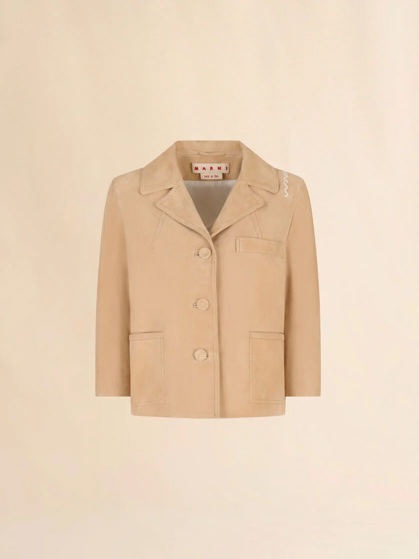 Relaxed-fit boxy jacket made from suede with a remarkably light, silky texture. Single-breasted closure with three buttons. 3/4 sleeves. Three front pockets. Hand-stitched Marni Symbol on the shoulder. Made in Italy MODEL GIMX0129MSULV88100C15 COMPOSITION Primary Fabric: 100% Ovine Leather - Lining: 69% Cotton Woven 31% Polyamide Woven - Pocket Lining: 100% Cotton Knit - Application: 100% Calf Leather