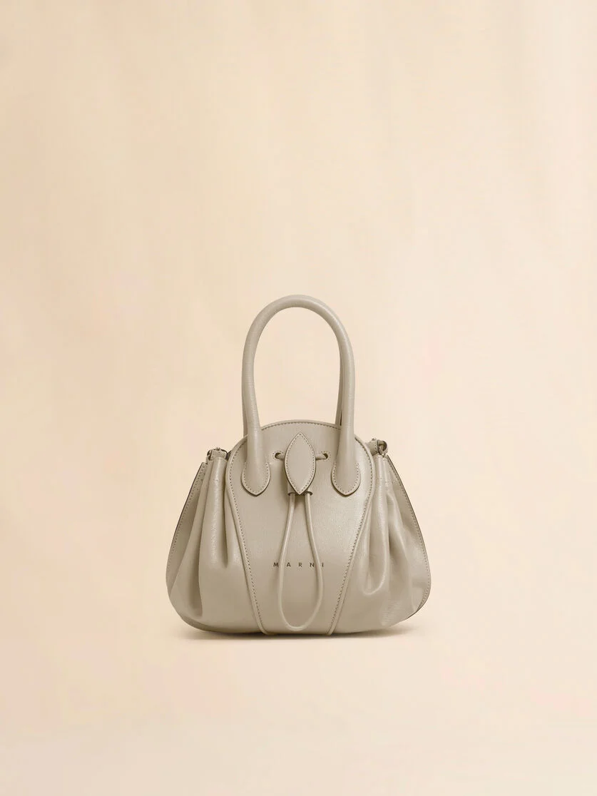 Tulipea small bag made from supple buffalo leather with natural veining and an uneven texture that renders every piece unique. Crafted with a rigid central body and flexible unlined bellows shape at the sides evoking the delicate opening of a bud. Tubular top handles and detachable shoulder strap with D-rings and studs. Hot-stamped silver Marni logo on the front. Drawstring fastening and soft faux suede lining. Made in Italy MODEL SBMP0223A0P871000W55