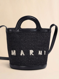 Tropicalia Small Bucket Bag made from raffia-effect fabric and leather. Drawstring-fastened sack bag inside. Leather bottom, shoulder strap and handles. Golden metal details. Embroidered logo on the front. Made in Italy MODEL SCMP0056Q1P386000N99 COMPOSITION Body: 52% Cotton 48% Polyamide-Nylon - Contrast: 100% Calf Leather - Lining: 100% Cotton - Metallic Parts: 100% Brass