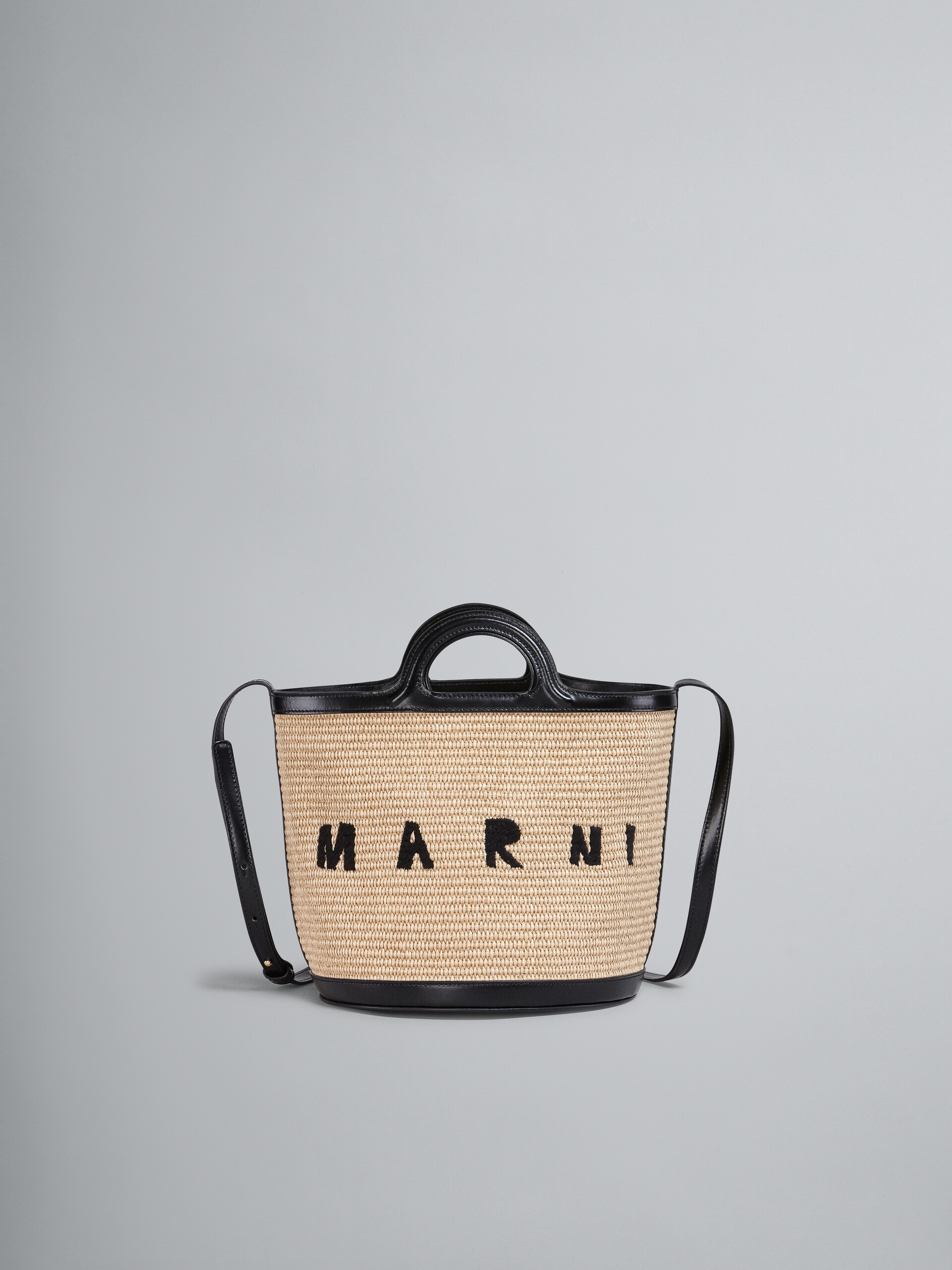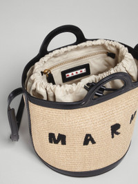 Raffia and calf TROPICALIA bag. Bucket bag; embroidered logo. Fabric drawstring bag. Leather bottom, shoulder strap and top handles. Made in Italy. DETAILS COMPOSITION Body: 52% Cotton 48% Polyamide-Nylon - Contrast: 100% Calf Leather - Lining: 100% Cotton - Metallic Parts: 100% Brass