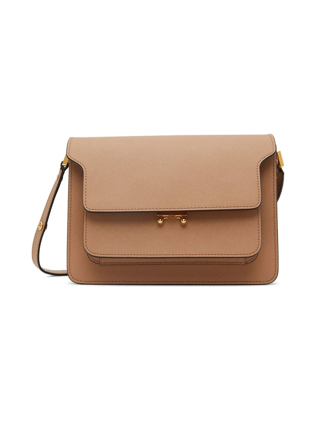 Saffiano calfskin shoulder bag in tan. Burnished edges in black throughout. · Adjustable shoulder strap with post-stud fastenings · Patch compartment and logo embossed at face · Accordion panel at sides · Patch pocket at back face · Foldover flap with press-release fastening · Two zip pockets at three-compartment interior · Textile twill lining in black · Logo-engraved gold-tone hardware · H6 x W9 x D4.75 in Supplier color: Brown sugar Calfskin.