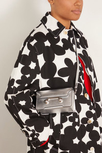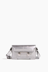 The Marni Trunkaroo Mini Shoulder Bag in Silver is crafted from metallic leather and features a front flap with magnetic closure and engraved Marni lettering with oversized stud details. FIT DETAILS - Contoured base on the front and back - One compartment with inside pocket - Lined in nappa leatherDetachable and adjustable buckled shoulder strap - Can also be worn as a clutch - Made in Italy - Body: 100% Ovine Leather - Lining: 100% Ovine Leather - Metallic Parts: 100% Brass - Metallic Parts: 100% Steel