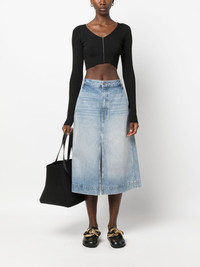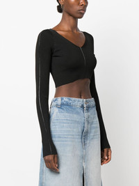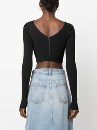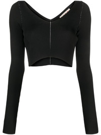 v-neck ribbed-knit crop top black knitted construction ribbed knit decorative stitching V-neck long sleeves V-back straight hem cropped Made In Italy Composition Viscose 94%, Polyester 6% SIZE & FIT Model measurements Height 5 ft 10 in(1.78 m) Bust/Chest 31.49 in(80 cm) Hips 37 in(94 cm) Waist 23.62 in(60 cm) FittingInformation Designed for a close fit throughout Made with a midweight knit, this piece offers some stretch This piece fits true to size – take your usual size Washing instructions Dry Clean Only