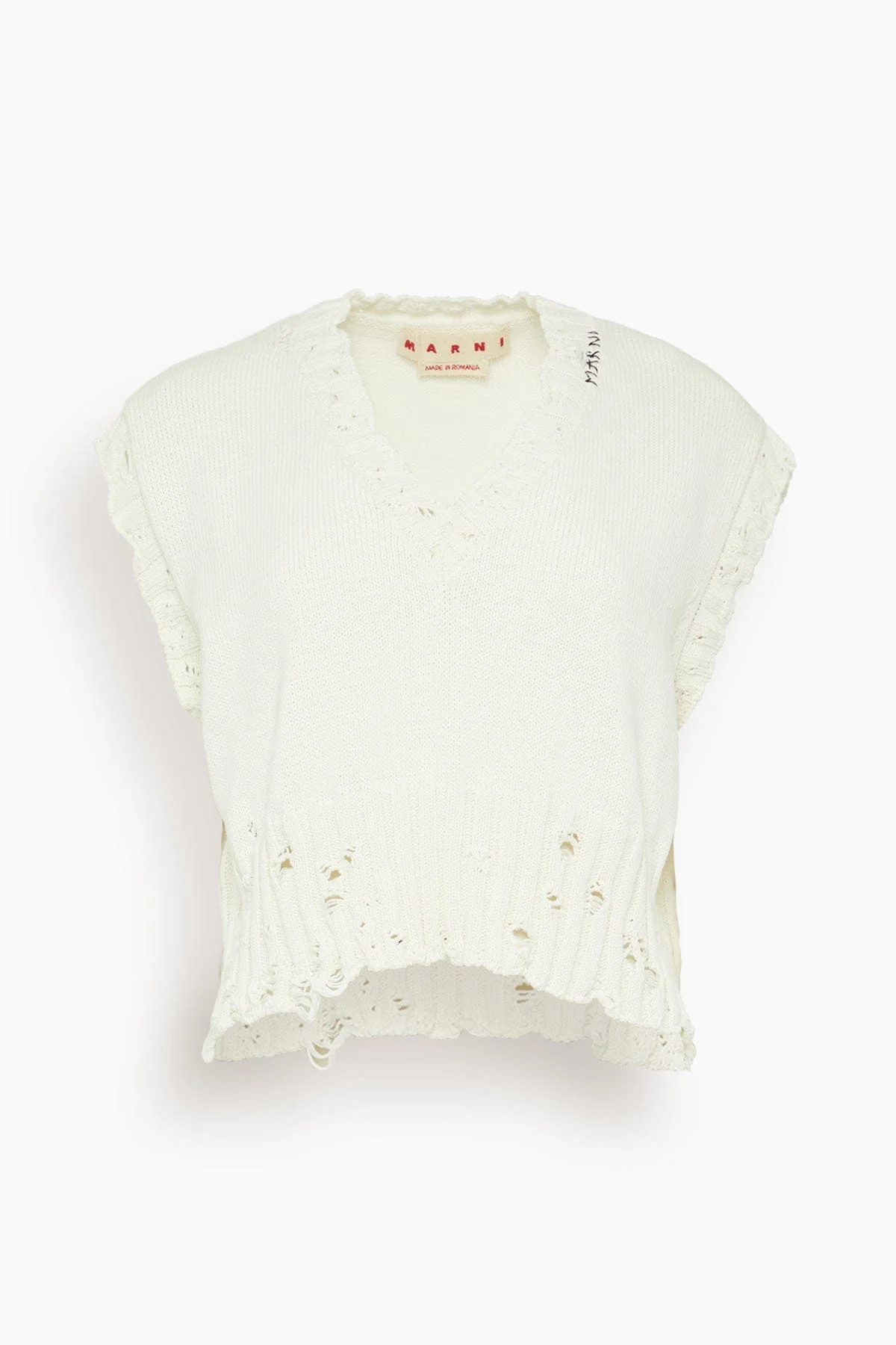 The Marni V-Neck Sweater Vest is a classic with a twist. This vest features a wide ribbed with distressing. Wear yours with jeans and loafers. FIT DESCRIPTION MODEL MEASUREMENTS - Fits true to size, take your normal size - Knit vest - V-neckline - Distressing - 100% Cotton - Celeste is wearing a size 38/ 2 US - Bust: 35" - Waist: 25.5" - Hips: 34" - Height: 5’10”