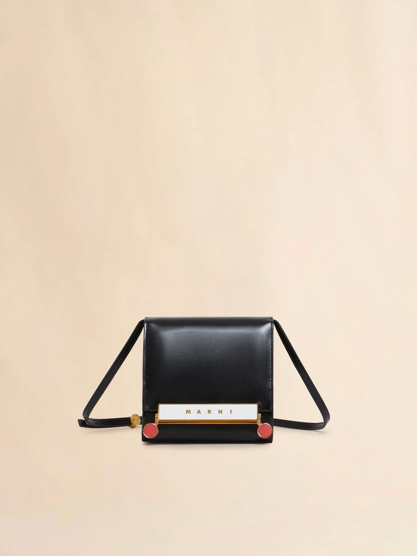 VHS triangular bag made from palmellato calfskin leather. Flap closure with enamelled Marni hook clasp. Structured box silhouette. Lined in luxurious sheepskin leather. Adjustable buckled shoulder strap. Made in Italy MODEL SBMP0243U0P829300N99 COMPOSITION Body: 100% Calf Leather - Contrast: 100% Calf Leather - Lining: 100% Ovine Leather - Metallic Parts: 100% Brass