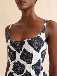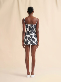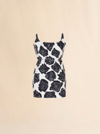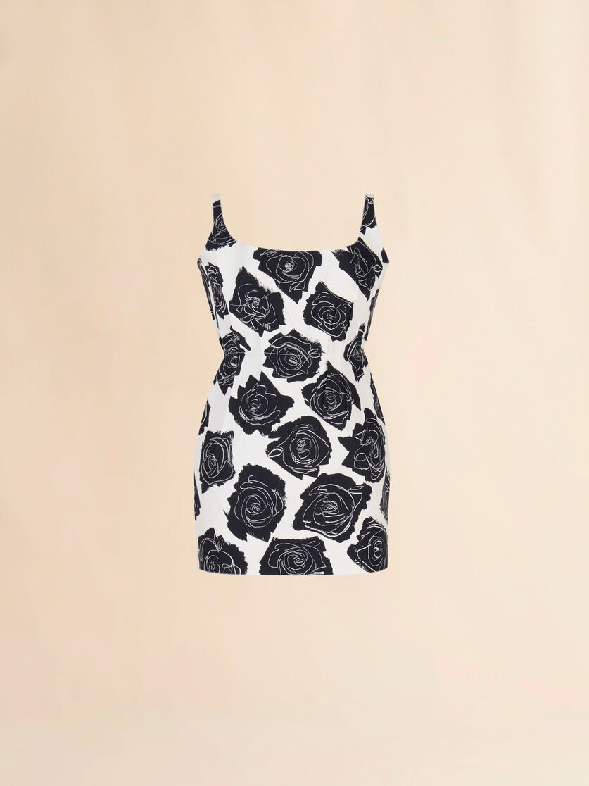 Mini dress made from bonded cotton poplin with a compact, weighty feel. Printed with this season's Luna black and white rose pattern, created using a special scraping technique on wet paint. Extra-low wide neckline and thin straps. Shaped with darts on the bodice. Back button closure. Made in Italy MODEL ABMA1417A0UTC537LUW01 COMPOSITION Primary Fabric: 100% Cotton Knit - Secondary Fabric: 100% Cotton Woven