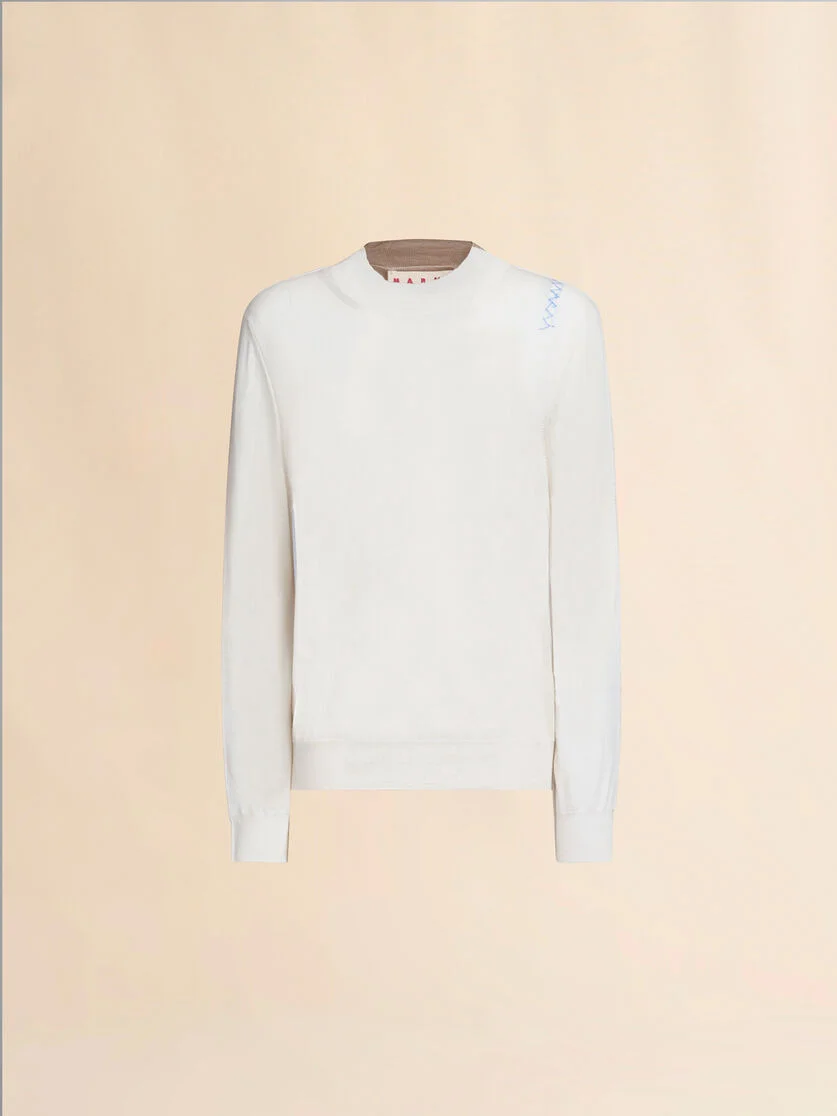 Silk and wool knitted jumper with long sleeves and a crew neck. The regular fit features a contrasting back panel, and a hand embroidered Marni Symbol on the left shoulder. MODEL GCMD0580Q0UFZ628HAW01 FIT The model is 5' 9''. The model is wearing size 40 IT. COMPOSITION Primary Fabric: 70% Virgin Wool Knit 30% Silk Knit