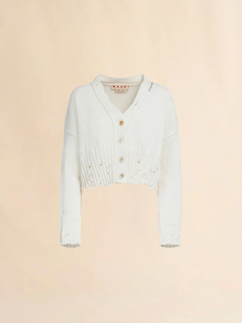Cotton cropped cardigan. Long-sleeved. V-neck. Horn button closure. Boxy fit with wide ribbed cuffs and hem. Ripped for a dishevelled look. Hand-stitched Marni mending logo with flower detail. Made in Italy MODEL CDMD0223A2UFC65200W01 FIT The model is 5' 11''. The model is wearing size 40 IT. COMPOSITION Primary Fabric: 100% Cotton Knit