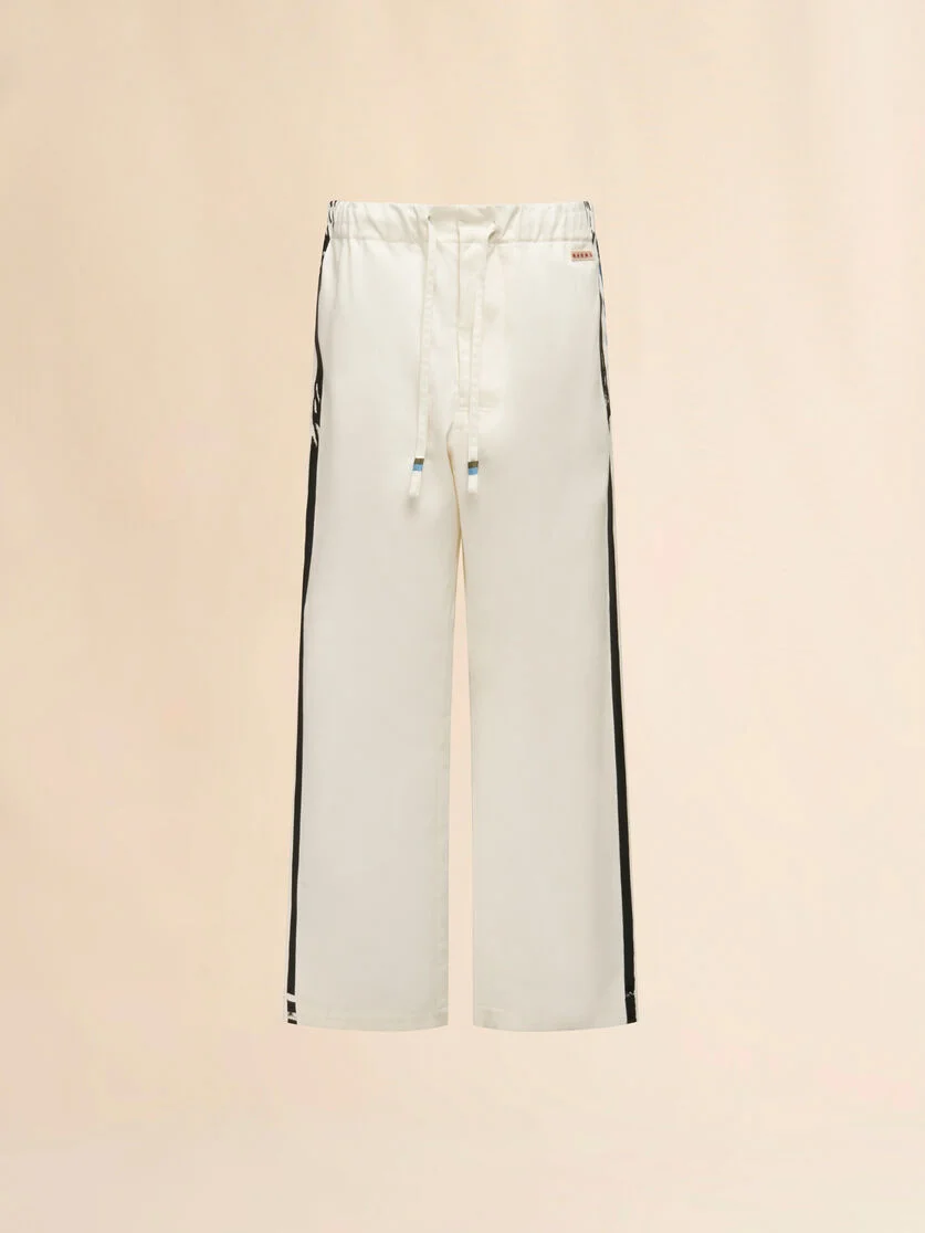 Track pants made from super-compact cotton gabardine, enriched with a glossy water-repellent finish. Detailed with textured brushstroke-effect stripes down the sides. Straight-leg cut with elasticated drawstring waist. Finished with an embroidered Marni patch on the waist. Made in Italy MODEL PAMA0641PXUTC56700W01