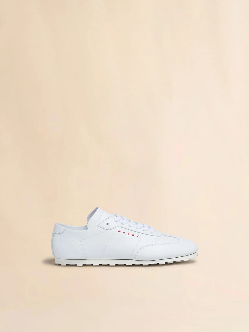 Low-top nappa leather sneaker inspired by retro soccer styles. Designed to offer slipper-like comfort with a flexible rubber outsole and deconstructed, unlined upper. Marni label on the tongue and logo grommets. Made in Italy MODEL SNZW020000P555800W01 COMPOSITION Upper: 100% Ovine Leather - Lining: 100% Ovine Leather - Inside: 100% Calf Leather - Sole: 100% Rubber