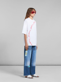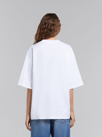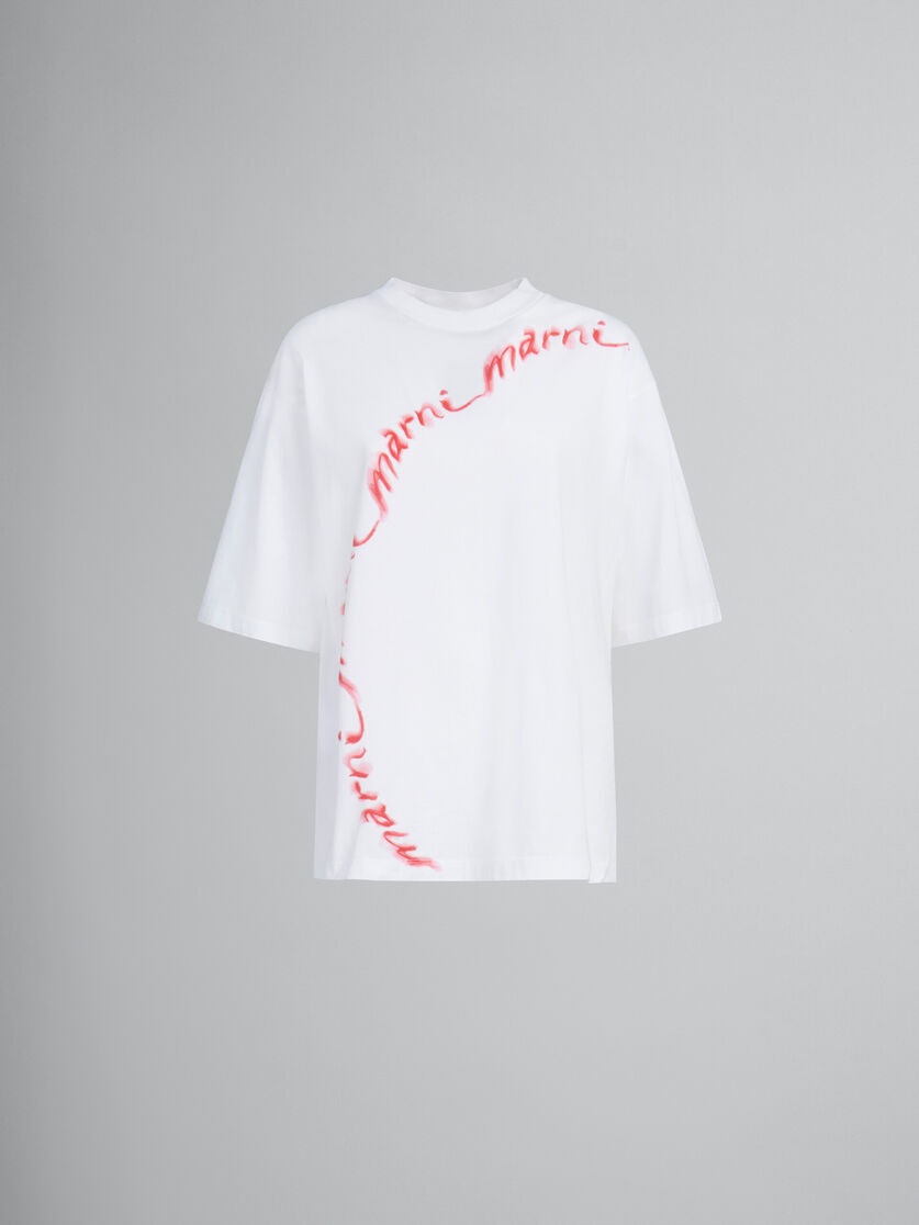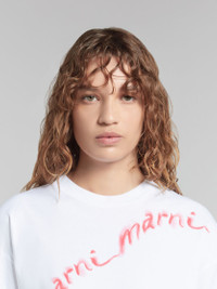 Crew-neck T-shirt made from organic cotton jersey. Loose fit with short sleeves. Embellished with wavy Marni lettering on the front, inspired by the petals of a rose. DETAILS COMPOSITION Primary Fabric: 100% Cotton Knit - Secondary Fabric: 100% Cotton Knit