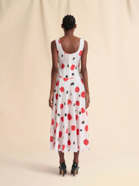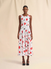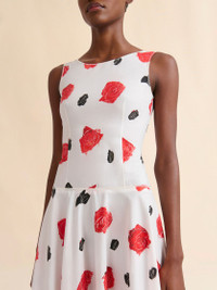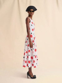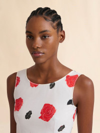 Long sleeveless dress made from organic cotton poplin. Fitted bustier top and full skirt. Round neck at the front and scoop back. Printed with this season's Iris black and red rose pattern, created using a special scraping technique on wet paint. Back full button closure. Made in Italy MODEL ABMA1446A0UTC501IRW01 COMPOSITION Primary Fabric: 100% Cotton Woven