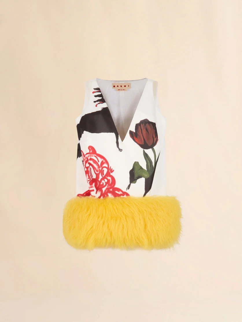 Sleeveless mini dress made from duchess satin. Embellished with a painterly wolves and tulips print created in collaboration with the artists Slawn and Soldier. Plunging V neckline and voluminous balloon silhouette. Soft lamb fur trim at hem and fully lined in a cupro-silk blend. Made in Italy MODEL ABMA1496UZUTP800WTW01