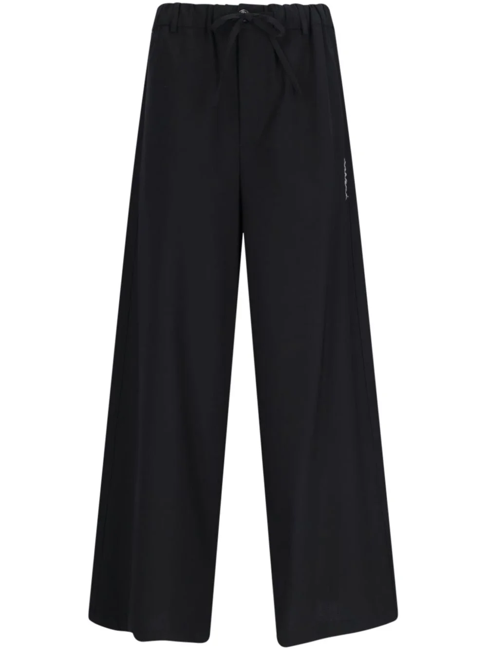 logo-print flared trousers Highlights - Black - Elasticated drawstring waistband - Front button fastening - Two side slit pockets - Rear jetted pocket Imported Composition Fabric 100%