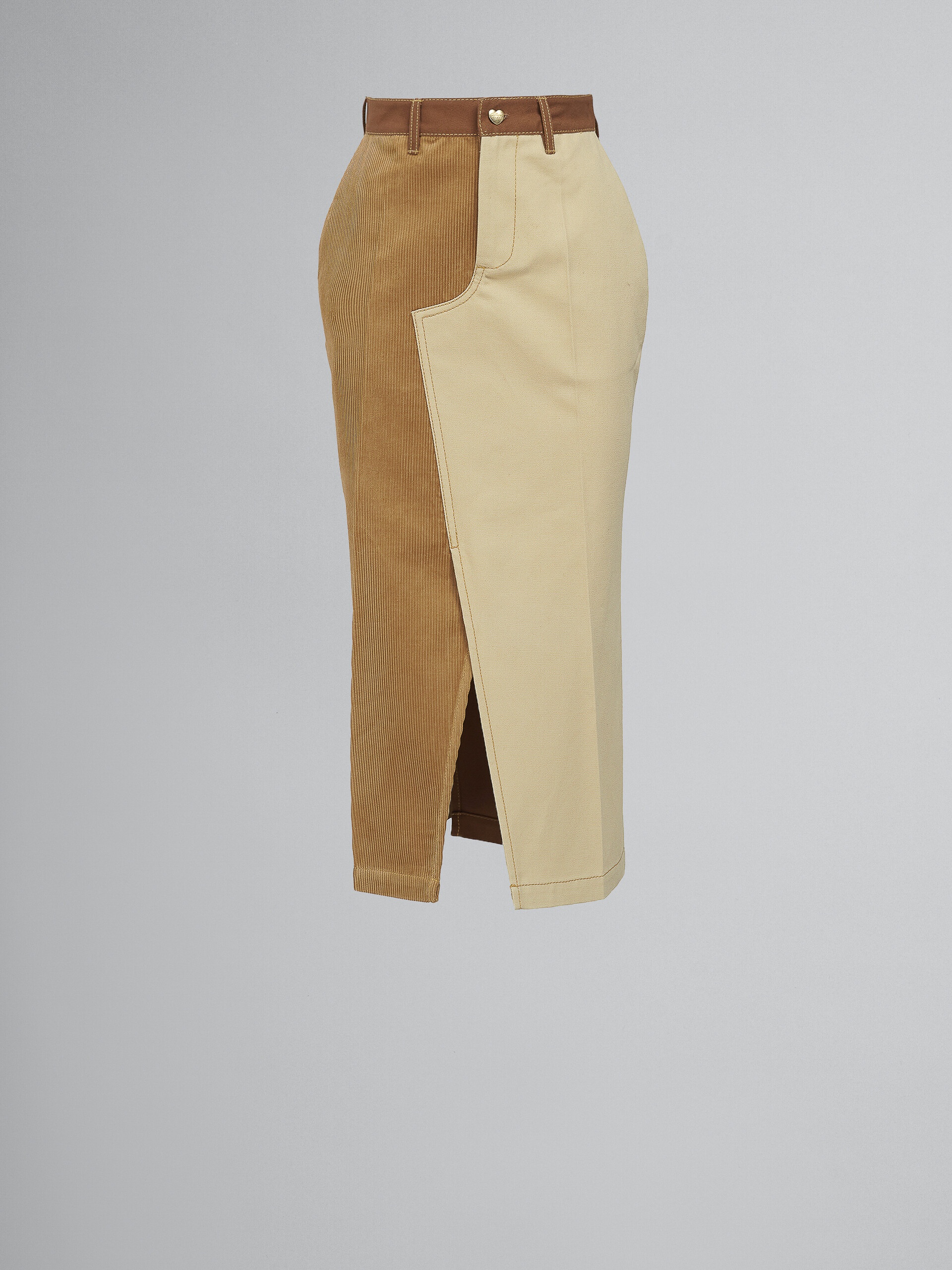 MARNI x CARHARTT WIP midi skirt, colour-blocked from washed bio cotton canvas and cotton corduroy. Heart-shaped button and concealed zip fly, styled with belt loops, rear welt pockets and contrast stitching. Branded with a Carhartt Work In Progress logo patch and embroidered "MARNI" lettering on the back. DETAILS COMPOSITION Primary Fabric: 100% Cotton Woven