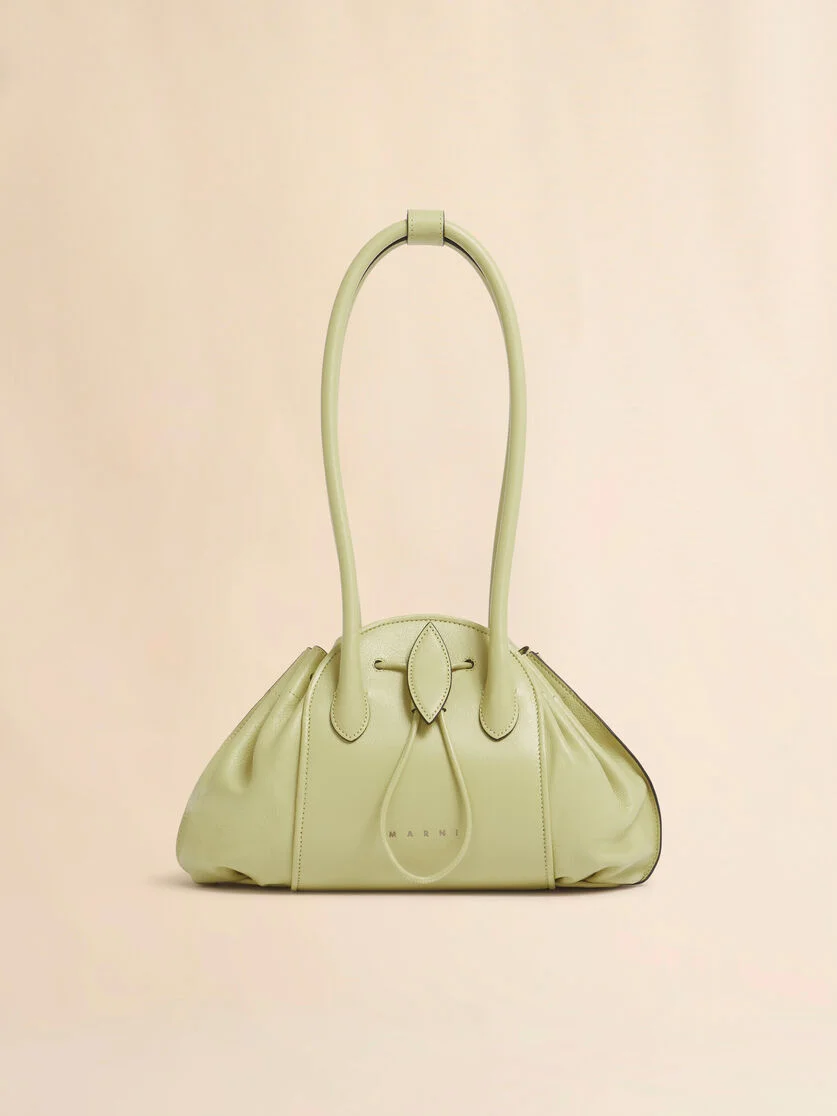 Tulipea Shoulder East/West shopper made from supple buffalo leather with natural veining and an uneven texture that renders every piece unique. Treated with a natural-effect glossy finish. Crafted with a rigid central body and flexible unlined bellows shape at the sides evoking the delicate opening of a bud. Top shoulder straps with detachable strap to secure in place. Hot-stamped Marni logo on the front. Drawstring fastening and soft faux suede lining. Made in Italy MODEL SHMP0156U0P871000V42